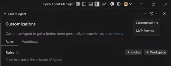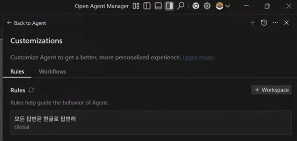 우측 ‘+Global‘ 탭 클릭하고, 좌측 GEMINI.md 부분에 “모든 답변은 한글로 답변해”라고 입력, Ctrl + S를 눌러 저장 후, 새로고침 아이콘 ‘Rules’를 눌러 반영 확인